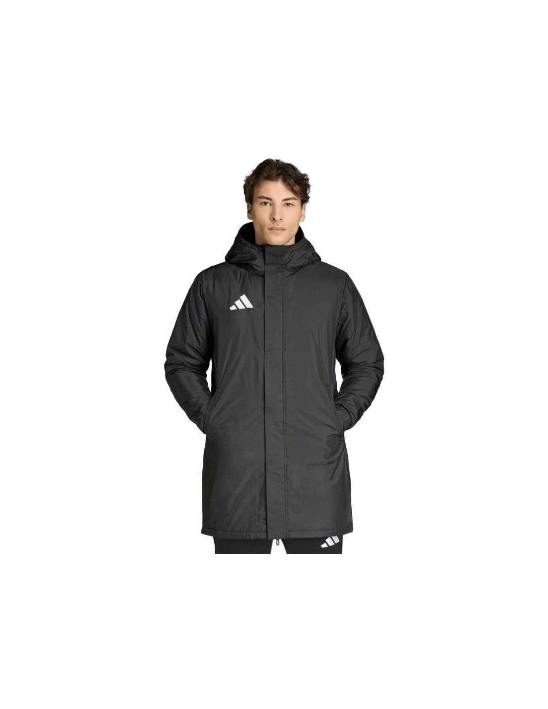 adidas Entrada 26 Stadium Jacket, Black JZ6668. This adidas men’s jacket is designed for lounging on the sidelines. It features a regular-fit, full-zip design. A fixed hood. Zippered side pockets. Cuffed cuffs. A snap-button storm flap. Synthetic insulation. Outer fabric: 100% recycled polyester. Filling: 100% recycled polyester.