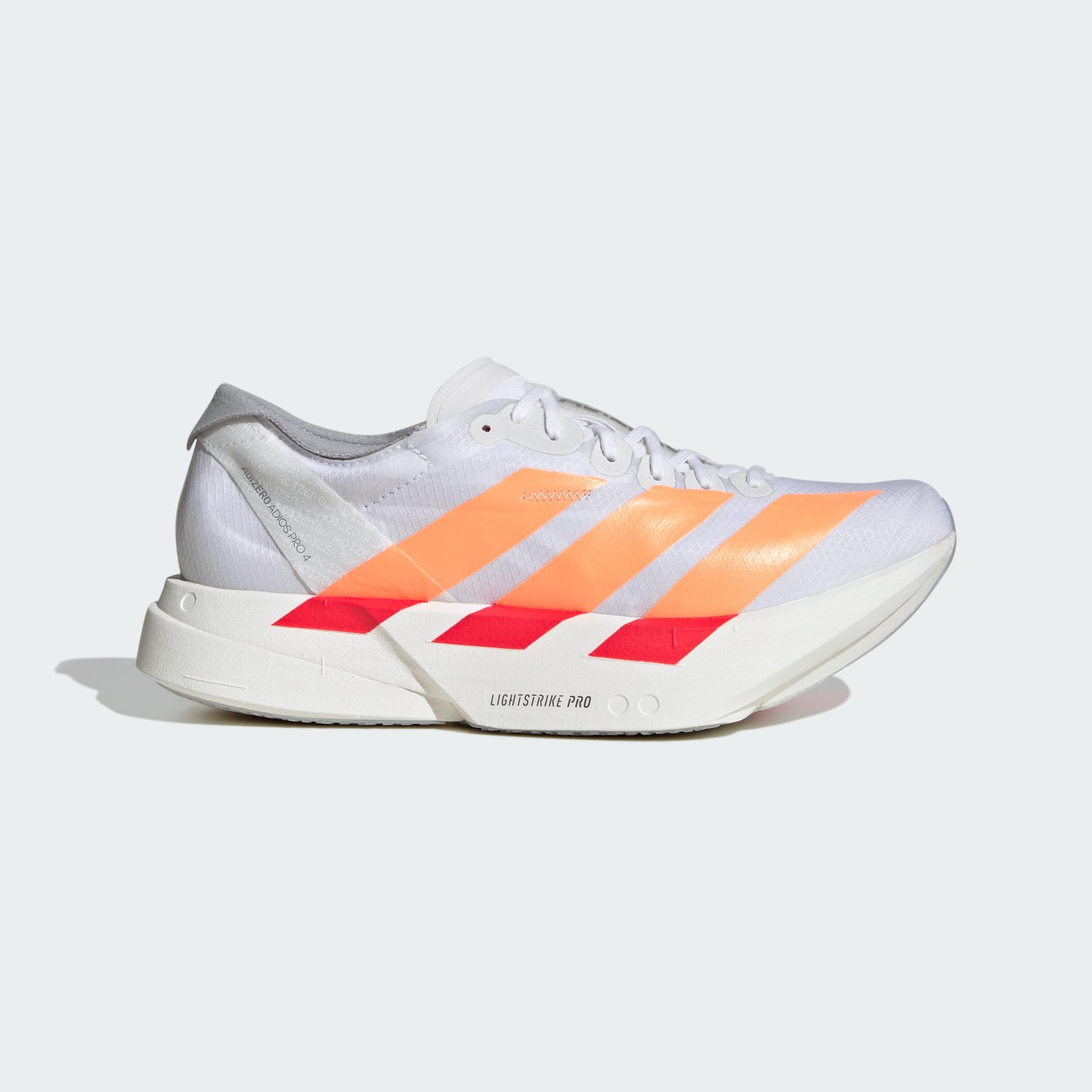 Τα Adizero Adios Pro είναι κορυφαία αγωνιστικά παπούτσια της Adizero και έχουν σημειώσει τις περισσότερες νίκες παγκοσμίως. Τα Adizero Adios Pro 4 σχεδιάστηκαν για τους γρήγορους δρομείς που θέλουν να απογειώσουν την ταχύτητά τους. Τα ENERGYRODS 2.0 με άνθρακα εξασφαλίζουν ομαλές μεταβάσεις από τη φτέρνα στα δάχτυλα, για υψηλές ταχύτητες χωρίς απώλεια ενέργειας. O νέος σχεδιασμός της ενδιάμεσης σόλας προσφέρει βελτιωμένη οικονομία στο τρέξιμο Τα δύο layers από τον καλύτερο αφρό μας, LIGHTSTRIKE PRO, απορροφούν τους κραδασμούς σε κάθε σου βήμα. Διαθέτουν εξωτερική σόλα κατασκευασμένη από καουτσούκ Continental™ για σταθερή μετάβαση κατά την εκκίνηση, και τεχνολογία LIGHTTRAXION που μειώνει το βάρος χωρίς να μειώνει την πρόσφυση.Πληροφορίες• Κανονική εφαρμογή• Δέσιμο με κορδόνια• Επάνω μέρος από ύφασμα και συνθετικό υλικό• Υφασμάτινη επένδυση• Lightstrike Pro ενδιάμεση σόλα απορρόφησης κραδασμών• Εξωτερική σόλα από καουτσούκ• Βάρος: περίπου 172 γρ. (μέγεθος EUR 38 2/3)• Drop ενδιάμεσης σόλας: 6 χιλ. (φτέρνα 33 χιλ. / 39 χιλ.)• Το προϊόν περιέχει τουλάχιστον 20% ανακυκλωμένο υλικό• Χρώμα: Λευκό