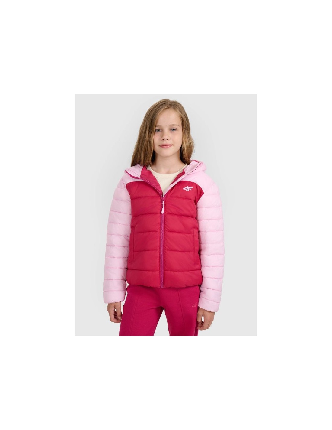 Girls’ down jacket with synthetic filling – warmth and style in pink This girls’ down jacket from 4F is perfect for girls who need effective protection from the cold while also wanting a lightweight and fashionable outer layer. The pink color scheme and quilted design combine functionality with style. :contentReference[oaicite:1]{index=1} CHARACTERISTICS: Fit – regular, designed with girls in mind, offers a comfortable fit and freedom of movement. Intended use – for everyday use, for school, walks, outdoor activities in the transitional season or colder days. Technology – Synthetic fill provides warmth even in wetter conditions, while remaining lightweight and easy to care for. :contentReference[oaicite:2]{index=2} Hydrophobic coating – limits moisture absorption, keeping the jacket dry and comfortable for longer. :contentReference[oaicite:3]{index=3} Functional details – high collar, hood, full zipper, side pockets and elastic cuffs and hem for better protection against the cold. Composition – outer material: polyester; filling: synthetic (detailed values not provided in the public description) :contentReference[oaicite:4]{index=4} Weight – medium-weight model, suitable as a main layer or a stand-alone jacket on colder days. The jacket is perfect as a top layer for autumn and winter days—just pair it with a base layer, such as a thermal or fleece. It pairs perfectly with leggings or outdoor pants, creating a functional and fashionable ensemble. Check also: girls’ jackets and vests , pants for girls