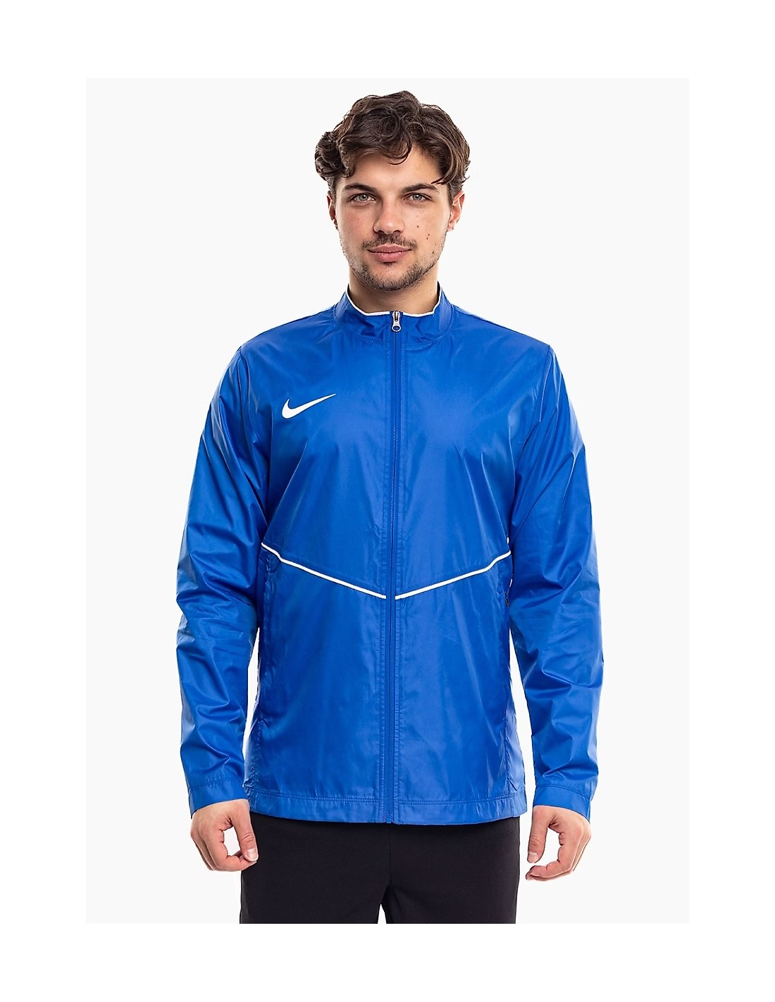 Nike Park 26 Rain Jacket, Blue HM7265 463. This Nike men’s jacket is perfect for training. Dri-FIT technology wicks away moisture. The fabric provides protection from light rain. Standard fit. Full-length zipper. Stand-up collar. Zippered side pockets. Piping. Small logo. Material: 100% recycled polyester