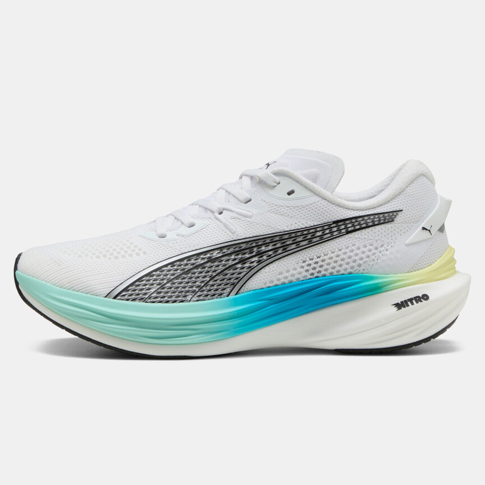 Λεπτομέρειες • Βάρος: 270 γρ. • Drop: 10 χιλ. • Δέσιμο με κορδόνια Χρώμα: Άσπρο Brand: Puma Τεχνολογίες • Τεχνολογία NITRO™ για αντικραδασμική προστασία και επιστροφή ενέργειας • Ενδιάμεση σόλα με carbon plate για μέγιστη ώθηση • Εξωτερική σόλα PUMAGRIP για εξαιρετική πρόσφυση Σύνθεση & Φροντίδα Σύνθεση: Ελαφρύ και αναπνεύσιμο επάνω μέρος