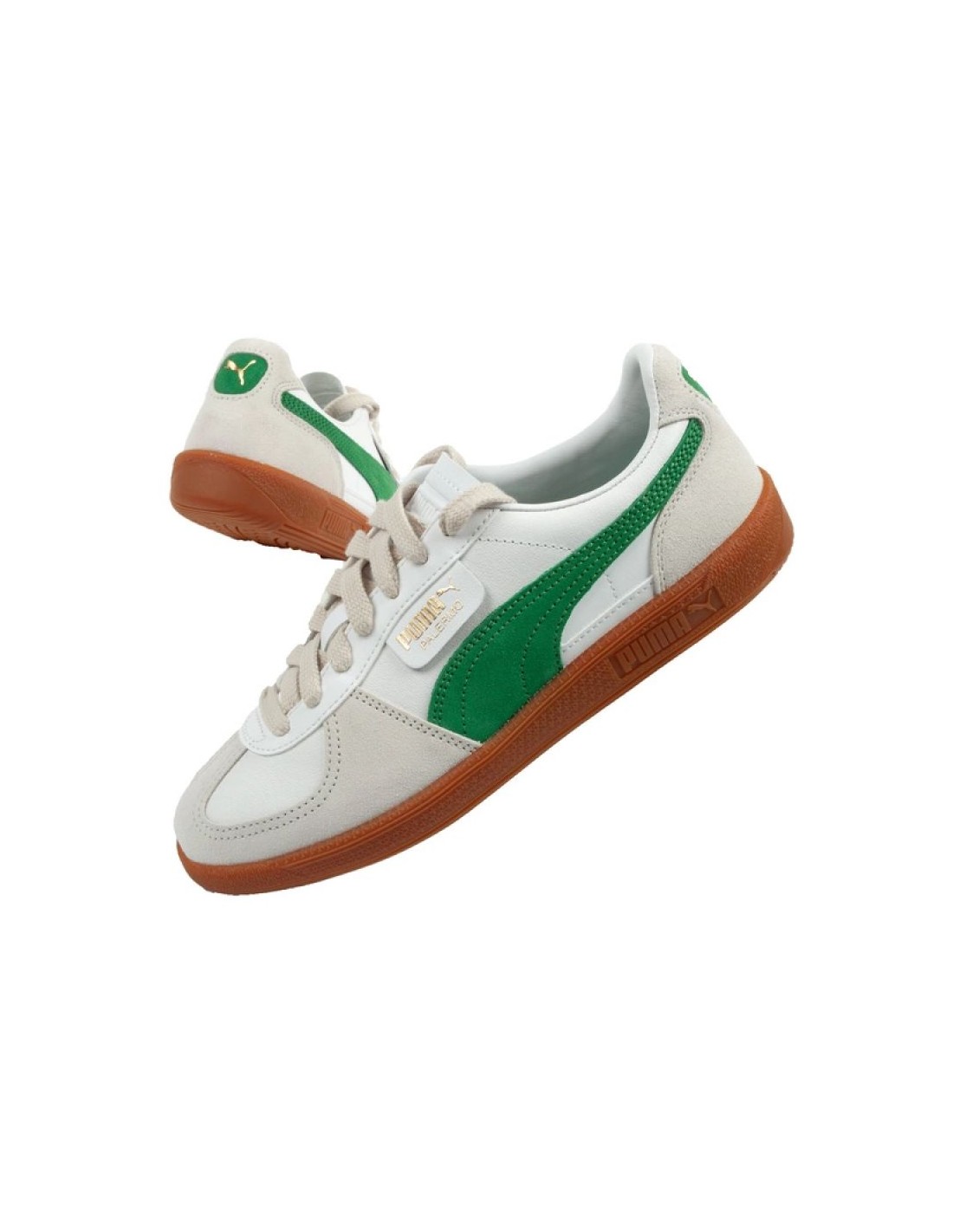 Properties: Women’s sports shoes by Puma. The upper is made of high-quality natural leather, which ensures durability and comfort of use. Suede overlays, including the distinctive Formstrip, add elegance and emphasize the classic design. The rubber sole with a characteristic pattern provides good grip and durability, making the shoes suitable for everyday use. The gold PUMA logo on the tongue and the “Palermo” lettering on the side emphasize the authenticity and refer to the original model. The classic lacing system ensures a perfect fit to the user’s foot.