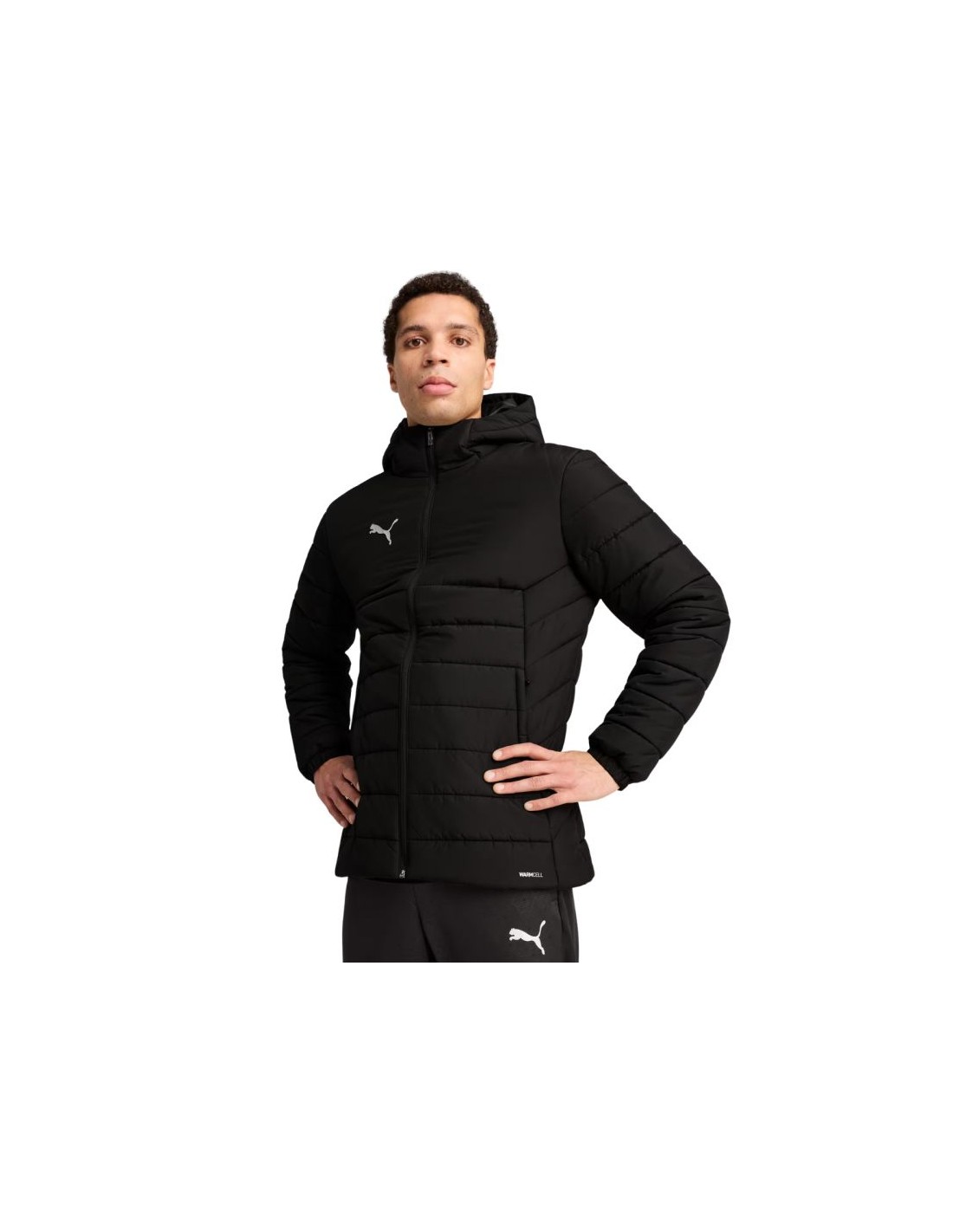 Puma Team Additions Hooded Padded Men’s Jacket Black 659795 03 The Puma Team Additions Hooded Padded Men’s Jacket is perfect for training and city wear. WarmCELL technology ensures comfort and optimal temperature maintenance thanks to highly functional and breathable synthetic materials. The regular fit and hip-length allow for a comfortable fit and freedom of movement. The integrated hood has a tight, fitted cut. Two side pockets protect your hands from the cold. Classic black color and a small Puma logo on the chest. Specifications: Main material: 100% recycled polyester