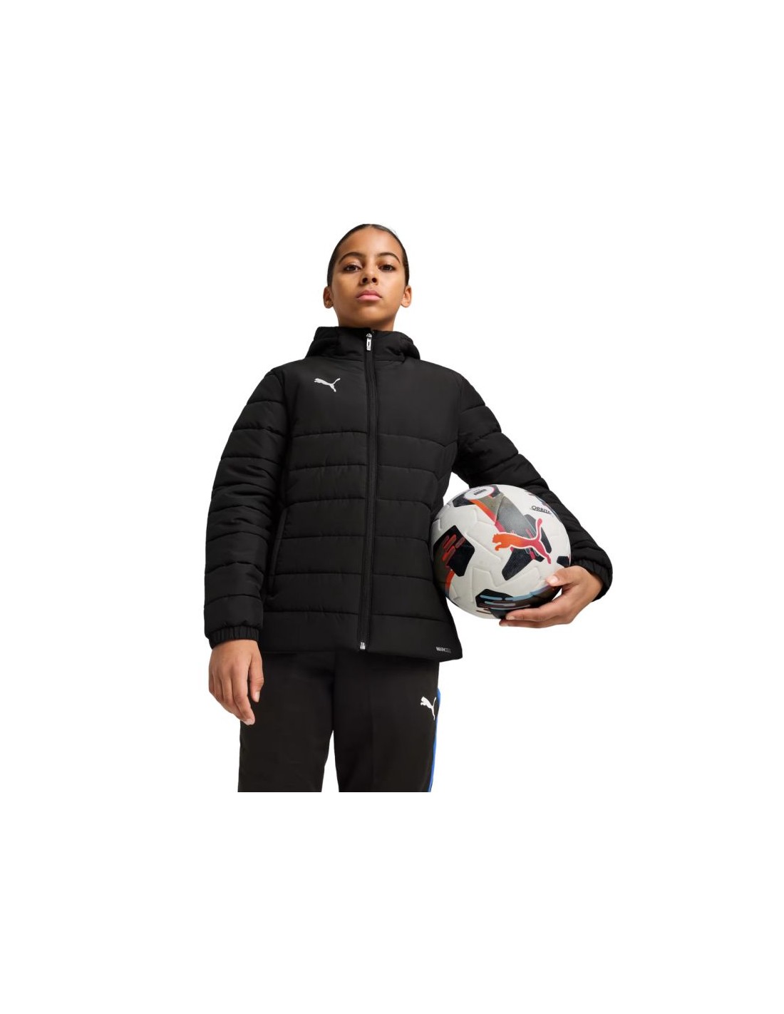 Puma Team Additions Padded Hooded Jacket for Kids, Black 659738 03. The Puma Team Additions Padded Hooded Jacket for Kids is perfect for training and everyday wear. WarmCELL technology ensures comfort and optimal temperature maintenance thanks to highly functional and breathable synthetic materials. The regular fit and hip-length allow for a comfortable fit and freedom of movement. The integrated hood has a tight, fitted cut. Two side pockets protect your hands from the cold. Classic black color and a small Puma logo on the chest. Specifications: Main material: 100% recycled polyester