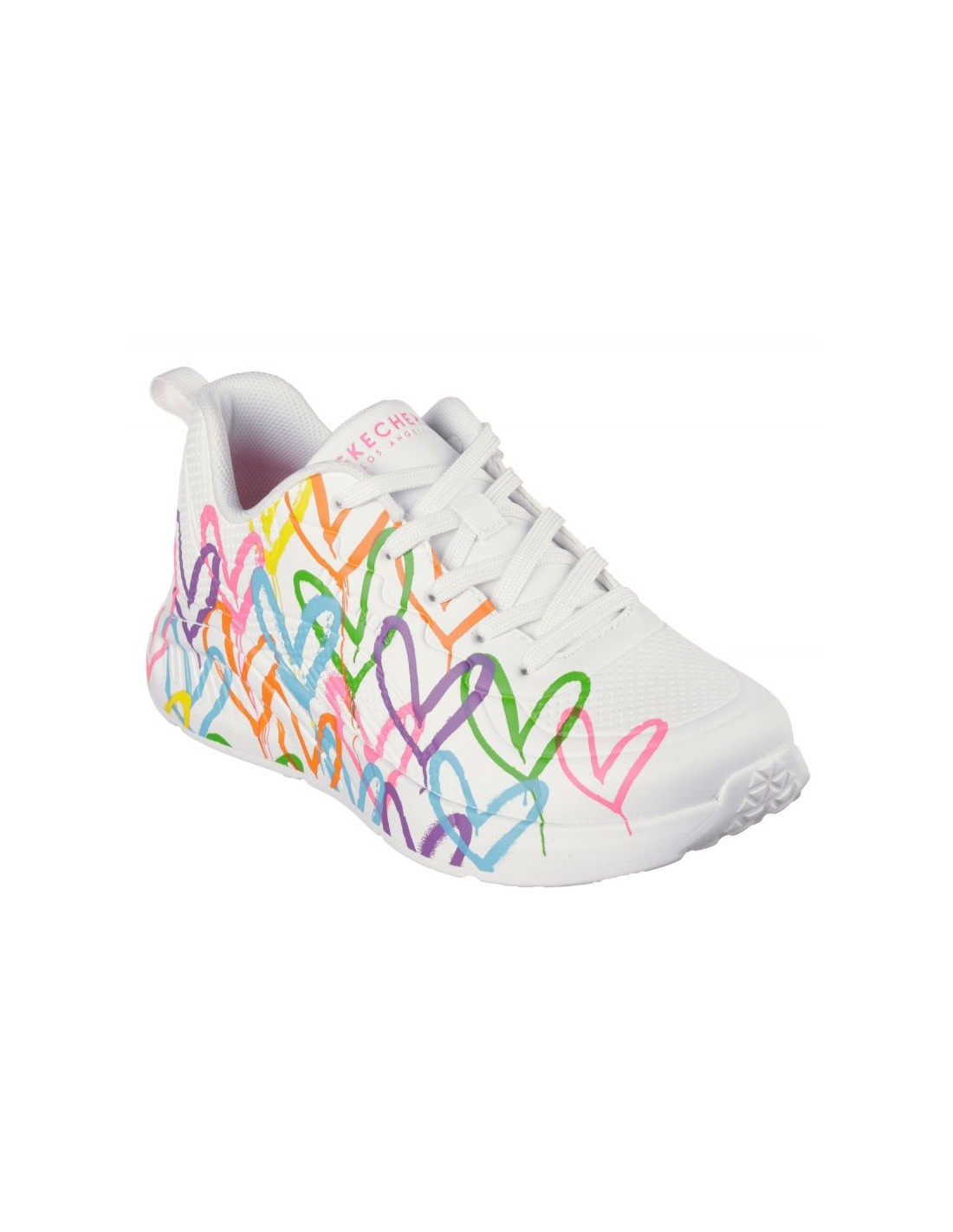 Properties: World-renowned muralist James Goldcrown brings his iconic #Lovewall heart patterns to Skechers in this inspiring collaboration. Show off your creative style with the Skechers x JGoldcrown: Skechers Street™ Uno Lite – Heart of Hearts. These lace-up, fashionable sneakers feature the artist’s signature heart print that extends onto the outsole, synthetic durabuck and perforated, finished uppers with a Skechers Air-Cooled Memory Foam® sockliner, and a platform midsole.