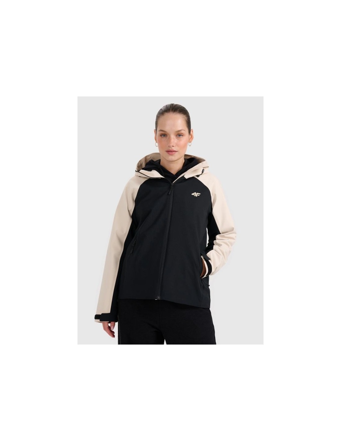Women’s transitional jacket with a hood – lightweight protection for everyday wear The 4f women’s transitional jacket is designed for everyday activities in variable weather conditions. Equipped with a Neodry 5000/3000 membrane, it effectively protects against light rain and moderate wind while ensuring good breathability. A hydrophobic outer coating reduces moisture absorption, while critically taped seams in the hood and shoulders enhance protection in key areas. A mesh lining improves air circulation, promoting thermal comfort on warmer days. The integrated, adjustable hood and high collar provide protection from the cold and wind. Hook- and-loop adjustable cuffs allow for a personalized fit, and practical zip pockets provide secure storage for small items. Women’s transitional jacket 4f – features: Neodry 5000/3000 membrane – protection against light rain and wind Hydrophobic coating – limits moisture absorption Critically taped seams – reinforced protection in the hood and shoulders Mesh lining – improved breathability and comfort Integrated adjustable hood for a better fit High collar – additional neck protection Velcro adjustable cuffs – individual fit 2 side pockets with zippers – safe storage of small items Internal zippered pocket – additional space for valuables One-way zipper with a wind flap – limits the penetration of cold Regular fit – comfortable fit and freedom of movement Composition : 100% polyester